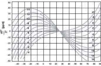 Figure 7 shows the relationship between the cut angle of the AT crystal and its frequency-temperature characteristics. The results show that AT-cut quartz exhibits excellent frequency stability over a wide temperature range. Because the first and second derivatives of the frequency-temperature curve (i.e., the first and second components of the temperature coefficient) approach zero within this temperature range, its frequency variation is primarily governed by a third-order function.