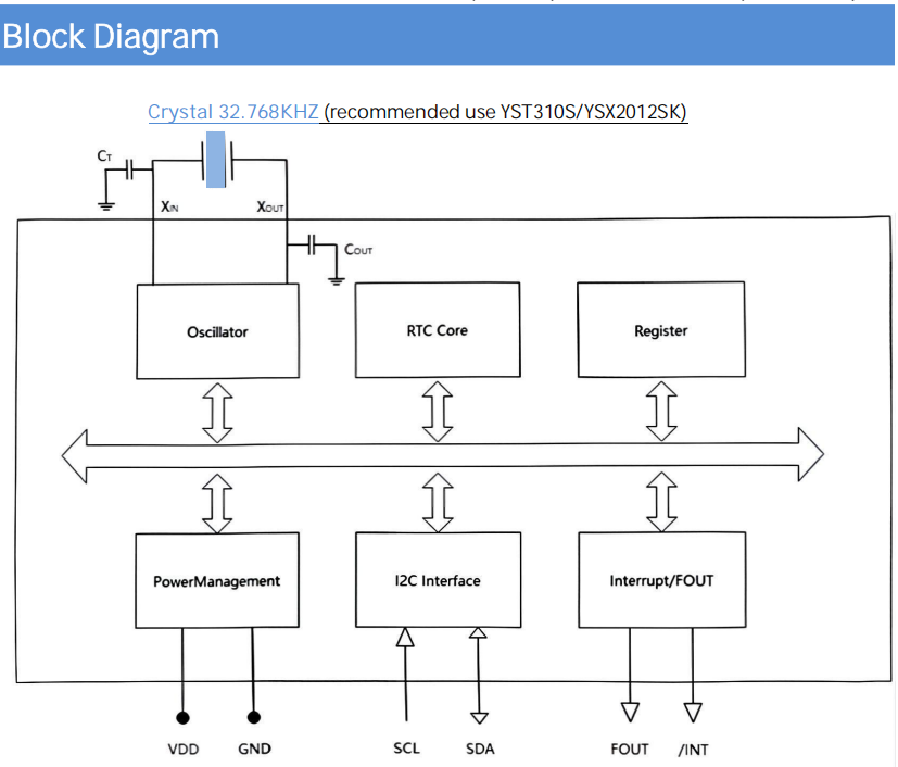 YSN8563 consists of an oscillator circuit (Oscillator), a real-time clock core (RTC Core), registers (Register), power management (Power Management), an I2C interface (I2C Interface) and an interrupt output circuit (Interrupt/Fout). The real-time clock core of YSN8563 is mainly responsible for providing accurate time management. Its clock signal and frequency source are provided by the internal oscillator circuit and the external 32.768kHz crystal oscillator.