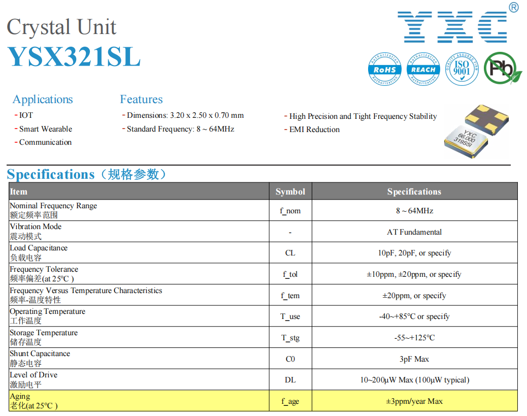 Aging rate is a key indicator to measure the frequency drift trend of crystal oscillators in long-term operation. The data sheet is usually marked as Aging, which affects the long-term stability of the system.