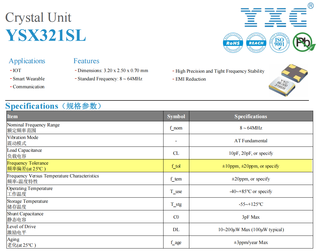 Figure: YXC Data Sheet - Frequency Tolerance (Yellow Highlight)