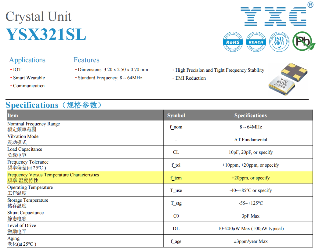 Figure: YXC Data Sheet - Frequency Temperature Stability (Yellow Highlight)