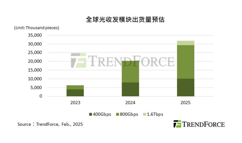 TrendForce pointed out that in the future, data transmission between AI servers will rely on a large number of high-speed optical transceiver modules, which are responsible for converting electrical signals into optical signals for transmission and then converting optical signals back into electrical signals for reception. According to statistics, the global shipments of optical transceiver modules above 400Gbps have reached 6.4 million in 2023, and are expected to exceed 31.9 million by 2025, with an annual growth rate of 56.5%.