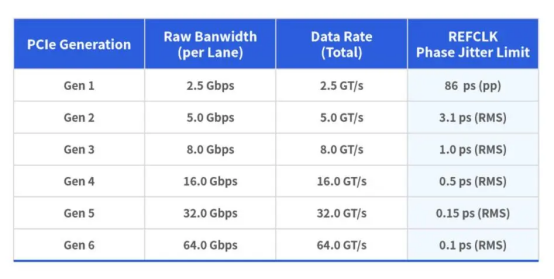With the upgrade of PCIe version, the performance requirements of reference clock have also been greatly improved. The following table shows the requirements of different PCIe protocol versions for reference clock RMS jitter: