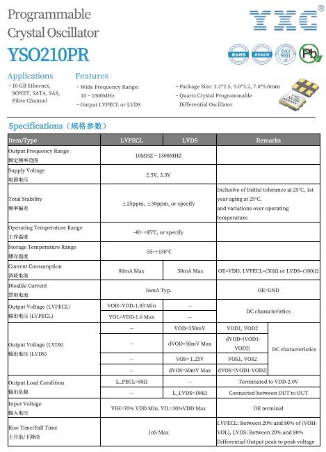 YXC crystal oscillator YSO210PR series, frequency is 125MHz, total frequency difference ±50PPM, the following is the YSO210PR series specifications.