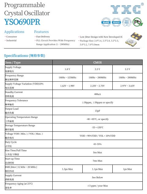YXC crystal oscillator YSO690PR series, the frequency is 22.578MHz, the total frequency difference is ±50PPM, the following is the YSO690PR series specifications.