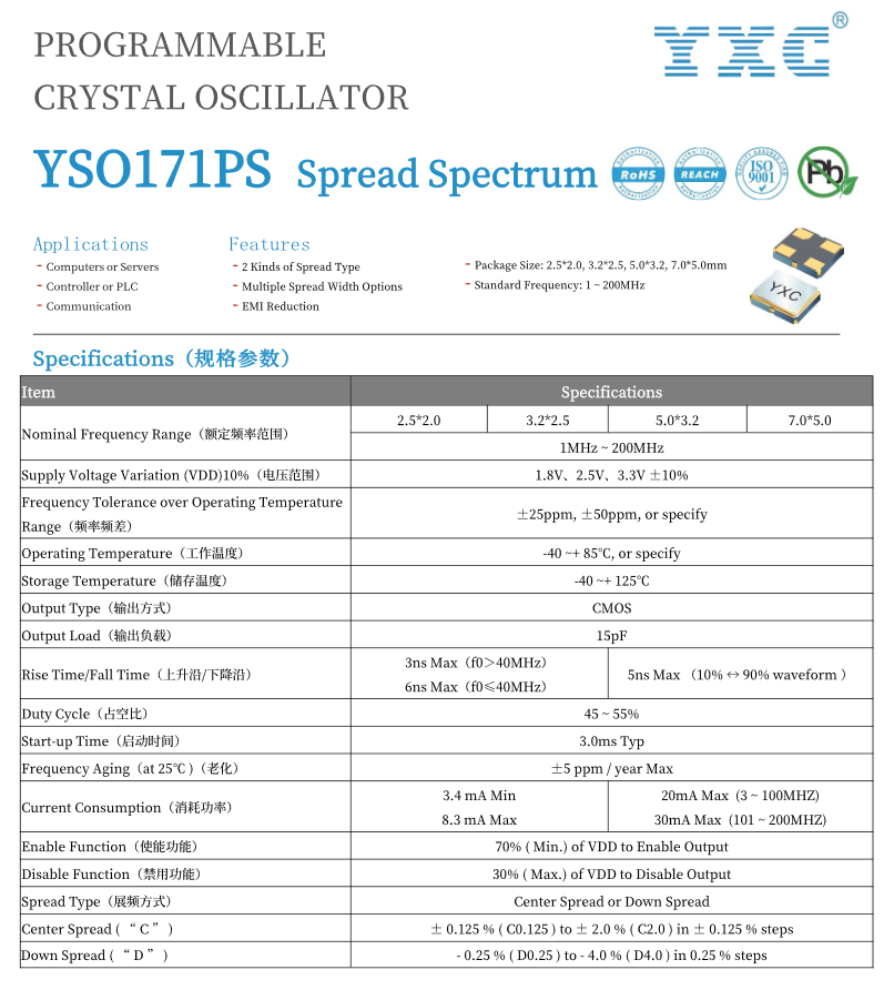 In response to the demand of domestic servers, YXC launched the OS2AI-JF4-50M material in the YSO171PS series of spread spectrum programmable crystal oscillators. The following are the typical parameters of OS2AI-JF4-50M and its application characteristics in domestic servers: