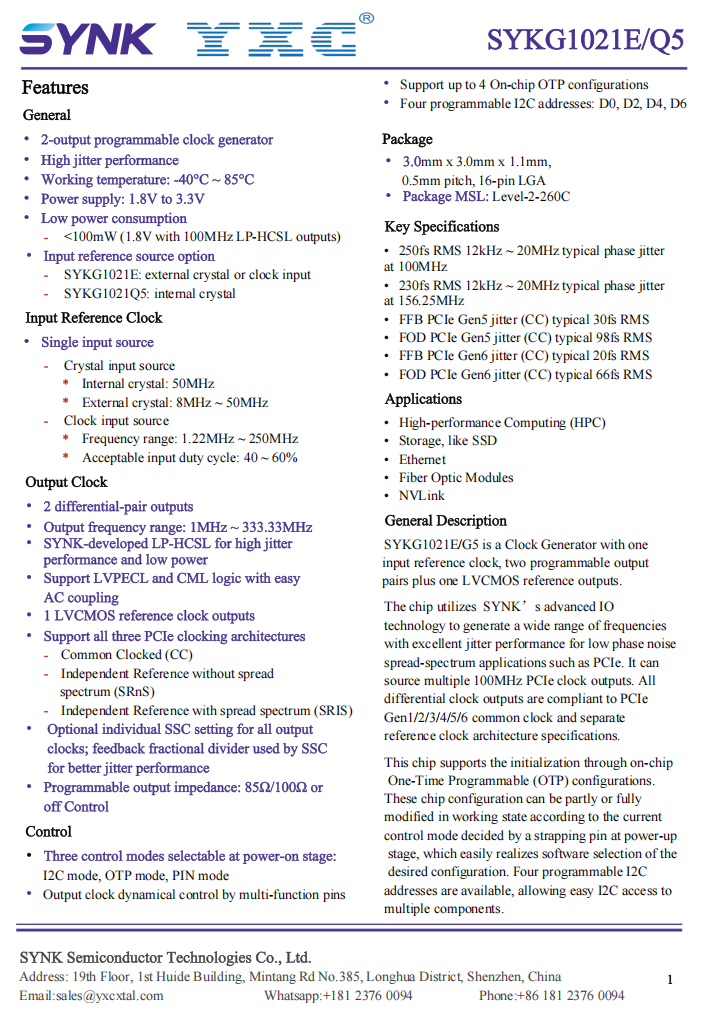 The SYKG1021Q5 is a dual-output programmable clock generator with ultra-low phase jitter. It features an internal 50MHz crystal oscillator, providing two differential pair outputs and one LVCMOS reference clock output. It supports flexible initialization methods, allowing selection of I2C, OTP, or PIN control modes during power-up. Fully compatible with various PCIe clock architectures, including CC, SRNS, and SRIS, it meets the precise clocking requirements of high-performance computing and storage systems.