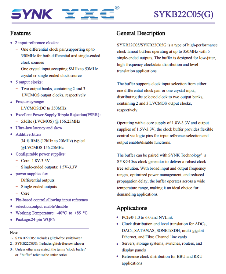 The SYKB22C05 is a 5-channel single-ended clock fan-out buffer with ultra-low jitter, designed for high-frequency, low-jitter clock distribution and level shifting. It supports one pair of differential clock inputs or one crystal input, with 2 and 3 LVCMOS clock outputs respectively. Flexible selection and dynamic switching allow it to meet the multi-clock domain requirements of complex systems.