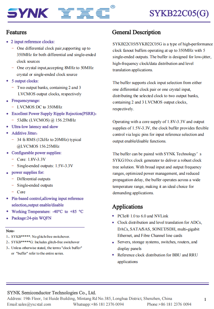 * The SYKB22C05(G) is a 5-output, ultra-low jitter single-ended LVCMOS clock buffer. It supports two input reference clocks (one differential/single-ended clock input, supporting up to 350MHz; and one crystal input).