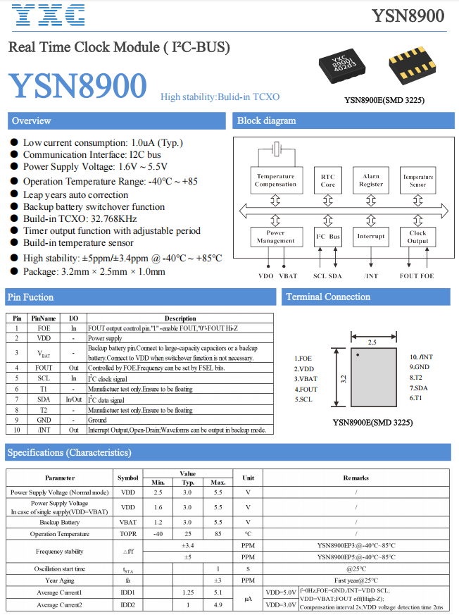 YSN8900 is a high-precision, low-power I2C bus interface real-time clock. It has a built-in 32.768KHz temperature-compensated crystal oscillator. It is equipped with a high-precision temperature sensor and temperature compensation circuit to ensure the high clock accuracy of the product. It supports calendar (year, month, day, hour, minute, second), clock and timer functions, etc.