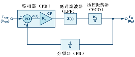 2. The phase-locked loop usually consists of a phase detector (PD), a filter (LF) and a voltage-controlled oscillator to form a forward path, and a frequency divider to form a frequency phase feedback path. The working principle of the phase-locked loop is to detect the phase difference between the input signal and the output signal, and convert the detected phase difference signal into a voltage signal output through the phase detector, and form a control voltage of the voltage-controlled oscillator after filtering by a low-pass filter, and control the frequency of the oscillator output signal. Then, the frequency and phase of the oscillator output signal are fed back to the phase detector through the feedback path.