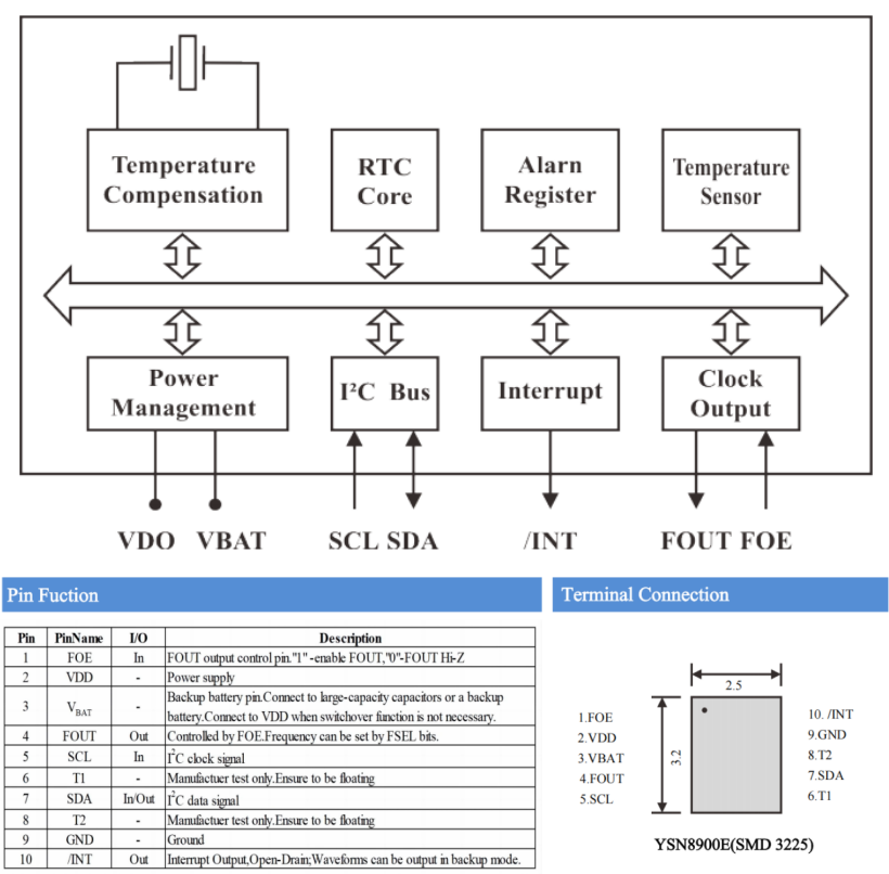The core architecture consists of eight major functional modules: temperature compensation unit, RTC timing core, alarm register, temperature sensor, power management unit, I²C bus interface, interrupt control unit, and clock output unit. interconnected via an internal bus, all modules are powered uniformly by the power management unit and interact with the system through external pins.