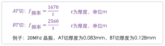 k represents different cutting method coefficients (1670 for AT cut and 2560 for BT cut), t represents thickness (unit: meter), and f represents frequency (unit: Hertz). The formula is as follows: