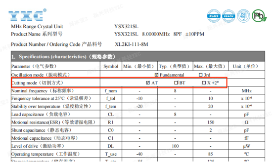 The YXC crystal oscillator manual also gives the cutting type of the crystal oscillator. The following example is YSX321SL, and the cutting method is AT cutting.
