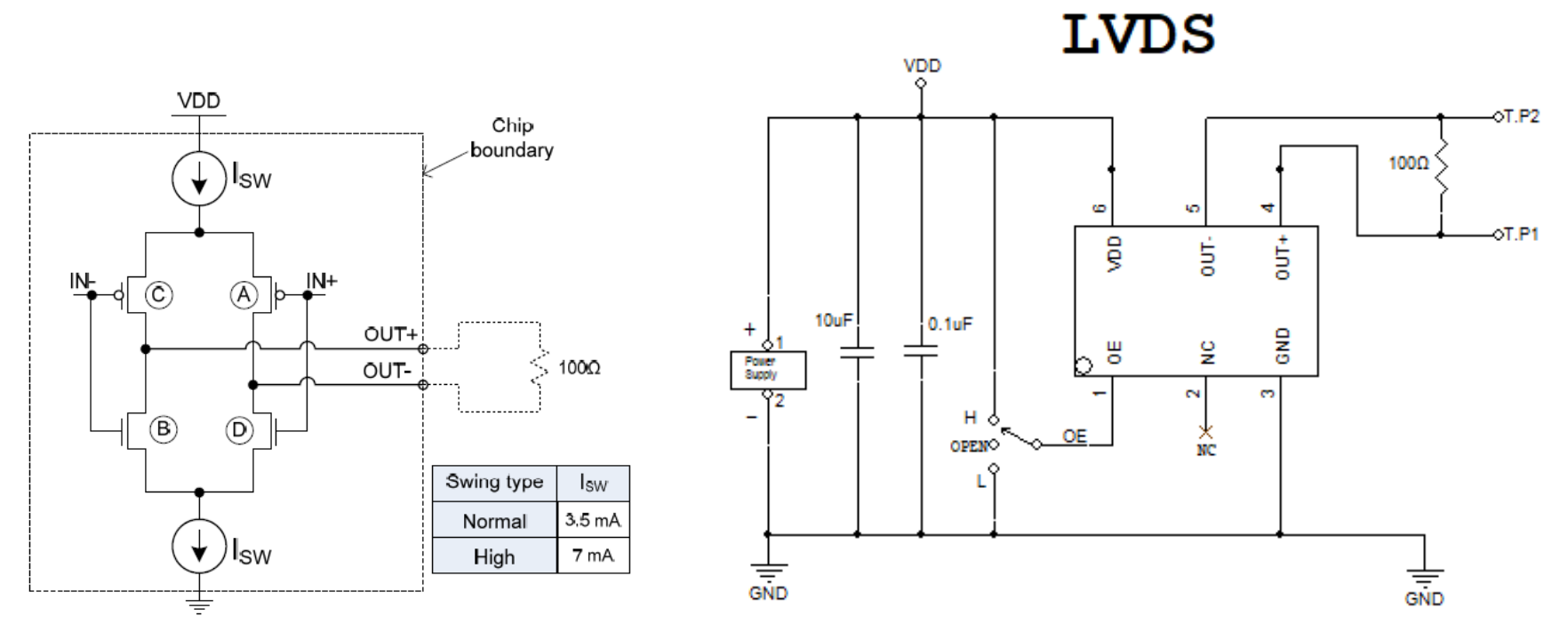 2、LVDS mode: LVDS (Low Voltage Differential Signaling) can provide a combination of low power consumption and low electromagnetic interference (EMI) at the same time. Due to the small voltage swing (usually 350mV), the power consumption is lower than that of the LVPECL differential output mode, and the current on the differential line with a load impedance of 100Ω generally does not exceed 4mA, making it less susceptible to noise. It is very important in applications such as audio and video processors, servers, routers and switches.