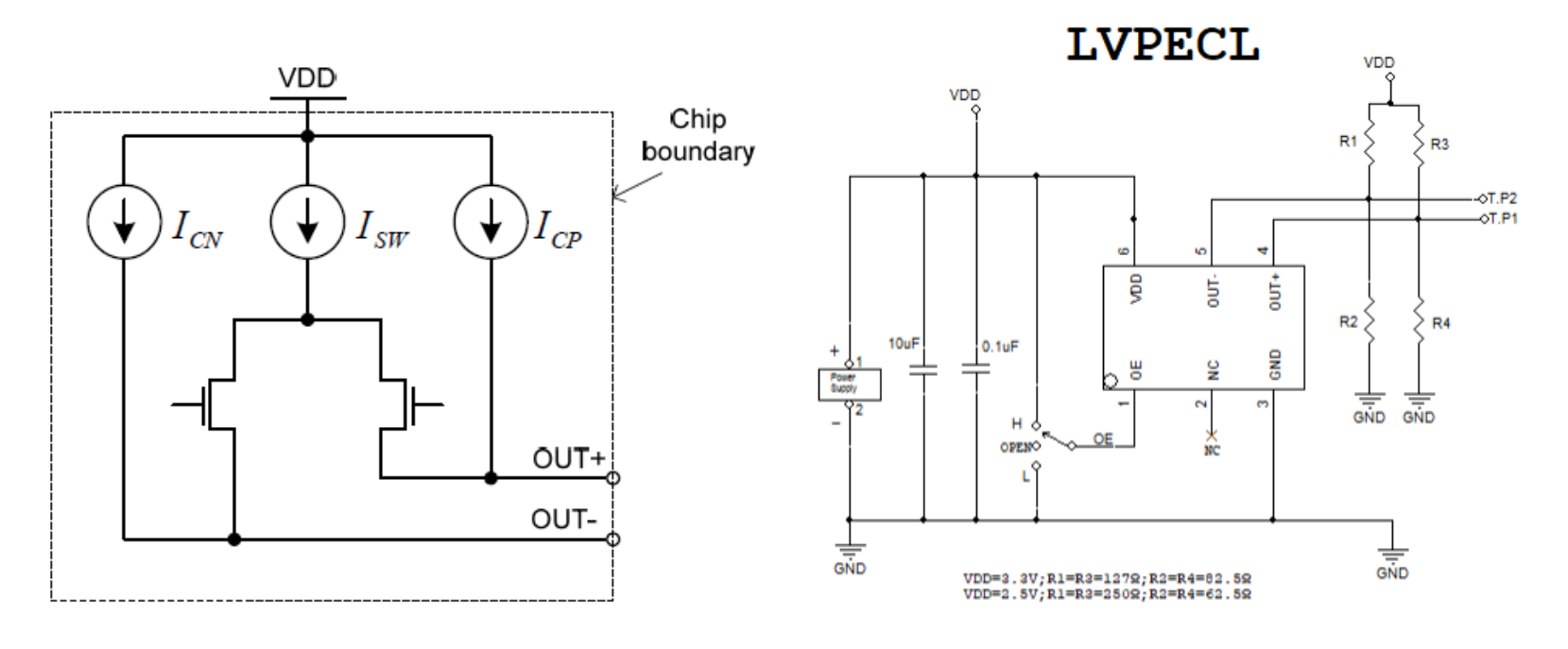 1、LVPECL mode: LVPECL (Low Voltage Positive Emitter-Couple Logic) is one of the main differential outputs. It achieves faster switching speeds by avoiding transistor saturation and is equipped with a constant current source driver. Due to the large voltage swing (usually 600-1000mV), LVPECL has excellent jitter performance, thus outputting low-noise signals, which is suitable for PON, graphics cards, optical modules, smart network cards, etc.