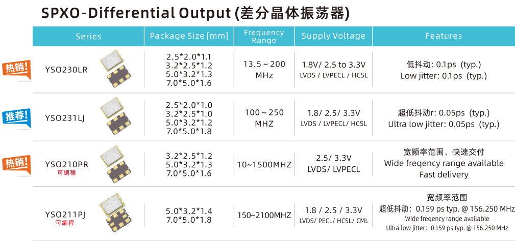 Among them, YSO211PJ programmable differential crystal oscillator, wide frequency range (150~2100MHZ), supports LVPECL, PECL, HCSL, CML output signal types. The programmable frequency accuracy reaches 6 decimal places to ensure the high performance of the system.