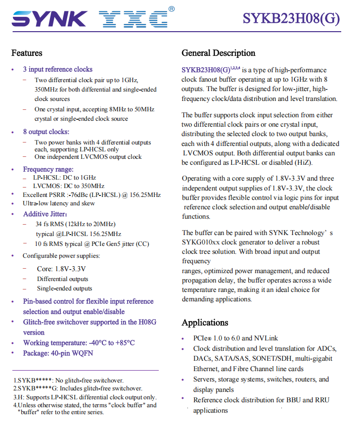 The SYKB23H08 is an 8-channel output, ultra-low additive jitter differential clock buffer designed for high-frequency, low-jitter clock distribution.
