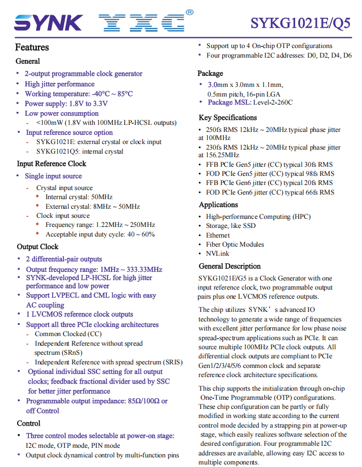 The SYKG1021E is a multi-output, ultra-low additive jitter, programmable clock generator.