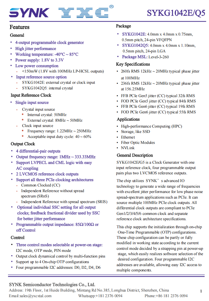 The SYKG1042Q5 is a 4-output programmable clock generator with ultra-low phase jitter. It features an internal 50MHz crystal oscillator, providing four differential pair outputs and two LVCMOS reference clock outputs. It supports flexible initialization methods, allowing selection of I2C, OTP, or PIN control modes during power-up. Fully compatible with various PCIe clock architectures, including CC, SRNS, and SRIS, it meets the precise clocking requirements of high-performance computing and storage systems.