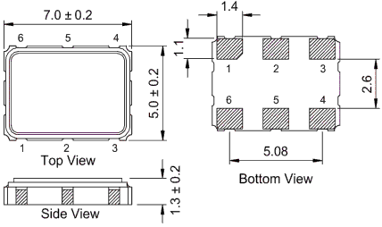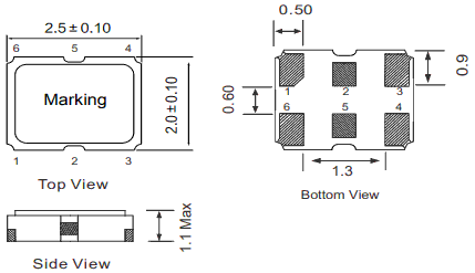 Dimension : 2.5 x 2.0 x 1.1 mm 3.2 x 2.5 x 1.2 mm 5.0 x 3.2 x 1.3 mm 7.0 x 5.0 x 1.3 mm